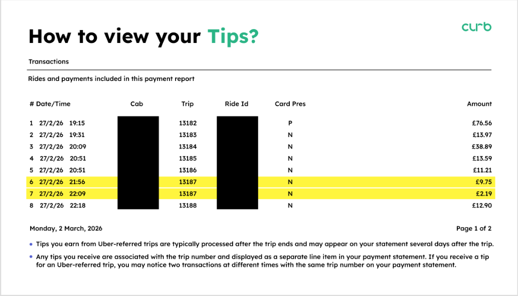 Drivers can view their payment statements on eFleet. Tips for Uber-referred trips are typically processed after the journey ends (up to 30 days) and may appear on statements for up to 30 days following the original trip. Tips are linked to the specific trip number and shown as separate line items. As a result, drivers may see two separate transactions with the same trip number, reflecting the tip added at a later date.